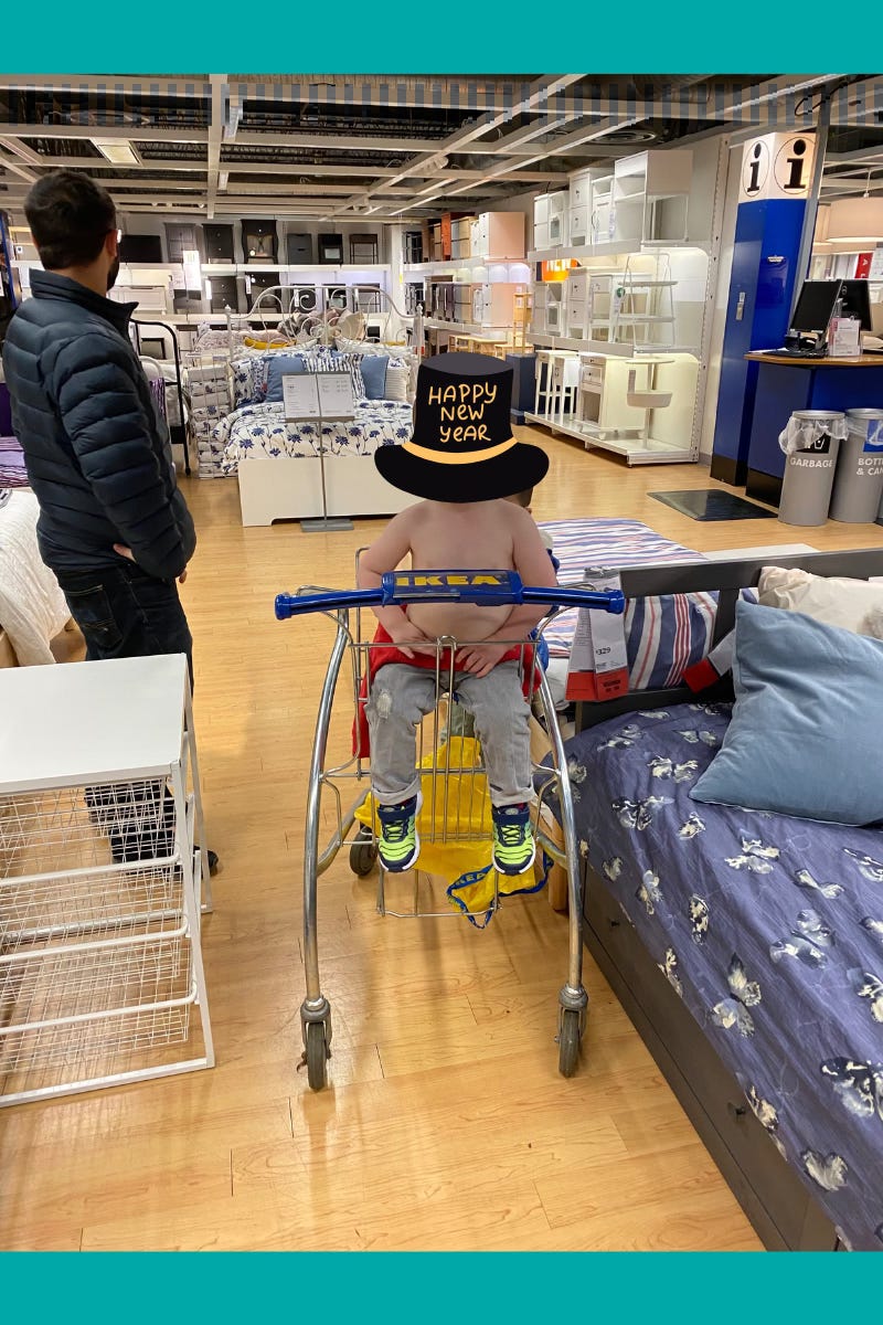 This photo is from the time we went to Ikea on New Year’s Day, and my then-toddler decided to take off his shirt while I was turned around. Because we have about as much control over our toddlers as we do our feelings.